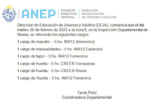 La Inspección Departamental de Rivera informa que el día 17 de febrero a la hora 14:00, se estará ofreciendo el cargo de Maestro de Apoyo de escuela N°3, por lista de aspiraciones en Educación Especial.